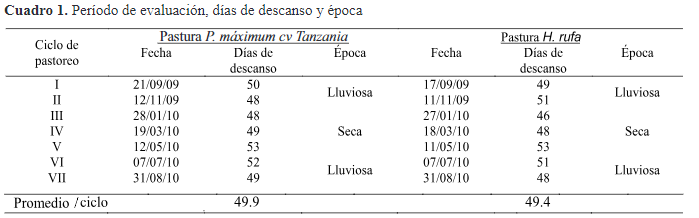 El levantamiento de información se realizó a partir de septiembre de 2009 hasta agosto 2010, rea-lizándose siete ciclos de pastoreo, tres de ellos en verano y cuatro en invierno con una frecuencia entre 48 a 53 días de descanso y un periodo de ocupación de 1 a 3 días según la época del año (cuadro 1).