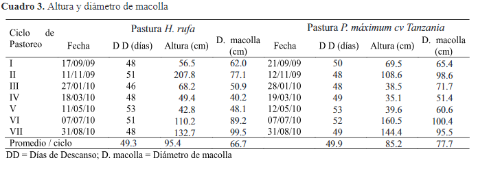 Durante el período de estudio la pas-tura H. rufa presentó la mayor altura promedio de la macolla con 95,4 cm, superando en más de 11% a P. máximum cv Tanzania. Lara (2005) determinó una altura en P. máximum cv Tanzania a los 84 días de establecido de 96 cm, siendo me-nor en comparación con los otros pastos de ese estudio. No obstante, este pasto superó en diámetro de macolla en más de 16,5% respectivamente a H. rufa (cuadro 3).