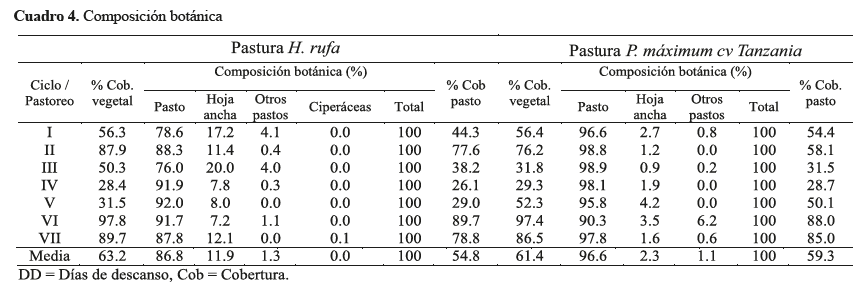 En relación a la cobertura de pasto estima-do con base a la cobertura vegetal y la composición botánica (cuadro 4) P. máximum cv Tanzania superó en más del 8% a H. rufa, lo cual incidió en una menor presencia de otras especies en particular las arvenses de hojas anchas que en promedio presentó 2,3% en la composición botánica de esta pastura