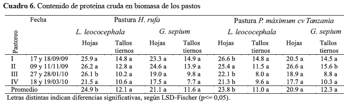 Disponibilidad de biomasa y contenido de proteína cruda de Hyparrhenia rufa y Panicum maximun cvTanzaniaasociadas con Leucaena leucocephala y Gliricidia sepium en sistema de pasturas en callejones