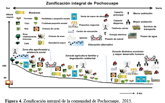 In Nicaragua there are years of planning experience at the territorial levels, which are translate into challenges for action processes at the territories. The integral zoning of a territory has the purpose of schematize the territorial dynamics, and considers that in the division of space there are relatively homogeneous zones, but different from one another in relation to development problems. The last aspect can be used for the promotion, articulation and harmonization of visions in the face of territorial problems and their approach with local actors. The objective of the present work was to analyze the current situation of the Pochocuape territory and integrally zoning the community. The work transcends a simple inventory of resources in the different dimensions of development, but seeks to understand the logic of the location and spatial distribution of them, as well as the interrelations between the dimensions, to finish with the zoning of the community. The present study was descriptive and analytical, with quantitative approach. It had a sample of 230 households selected for convenience, and was carried out during May 2015. Taking into consideration the particular characteristics for zoning the region, it was identifi ed that despite the proximity to the urban area of district three, rurality still prevails. It was found, according to the dimensions proposed, that for environmental dimension there is a sub classifi cation in three zones, two zones for the social dimension and three for the economic. The environmental and the economic dimensions are coincident, and there is heterogeneity in the social domain.