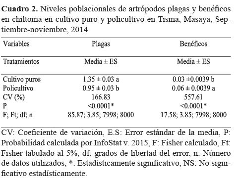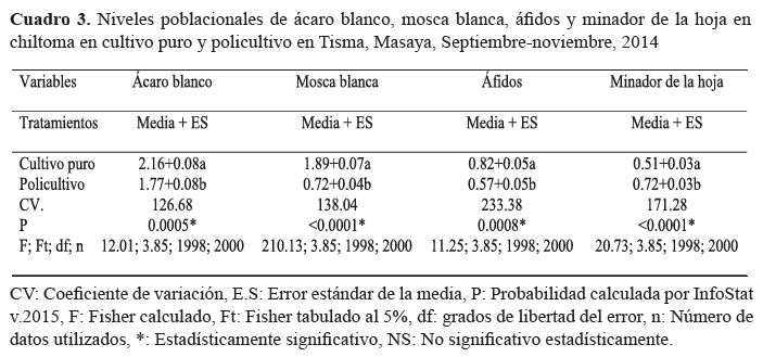 plagas en arreglos de policultivo y cultivo puro en Tisma, Nicaragua