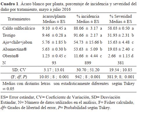 Severidad del daño ocasionado por ácaro blanco. Los tratamientos Oberón®, Ajo+chile+jabón y Abamectina® presentaron los porcentajes de severidad más bajos con 0, 12.5 y 17.5% de afectación a los 53 ddt, en este mismo periodo los tratamientos caldo sulfocálcico y el testigo presentaron los porcentajes de severidad mas altos con 42 y 87.5 % respectivamente. El análisis de diferencia de medias según Tukey al 5% demuestra que existe diferencia significativa (P ≤ 0.001) entre los tratamientos evaluados obteniendo que el tratamiento Oberón®, Ajo+chile+jabón y Abamectina® presentan los porcentajes de severidad más bajos con medias de 2.66, 15.63 y 19.03% (cuadro 1). Los tratamientos que presentaron los porcentajes de severidad más altos fueron el testigo y el caldo sulfocálcico con 58.03 y 31.93 % De Coss-Romero y Pena, (1998) señalan que los ácaros fitophagos como el ácaro blanco, por las características de su parte orales, son menos capaces de penetrar en los tejidos lignificados lo que es probable que exista la mayor severidad en los rebrotes tiernos.