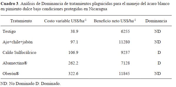 Según Rodríguez et al., (2012) las aspersiones con Dicofol® 18.5 C.E, y Abamectina® 1.8 E.C, disminuyen las poblaciones del ácaro blanco en chiltoma, pero tiende a incrementar al final del ciclo del cultivo.