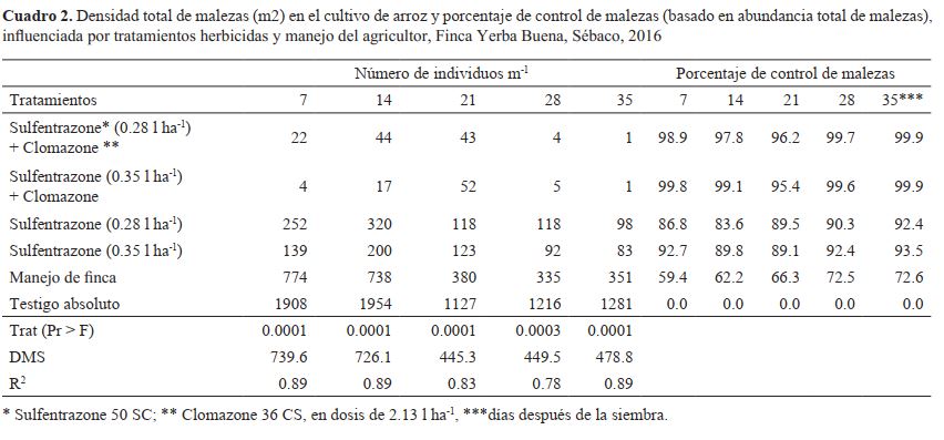 Efecto del herbicida sulfentrazone 50 SC, en dos concentraciones, solo y en mezcla con clomazone 36 CS, para el control de malezas en el cultivo del arroz, Sébaco, época lluviosa, 2016