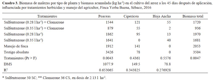 La menor acumulación de biomasa se obtuvo en el tratamiento Sulfentrazone 0.35 l ha-1 + Clomazone, con 936 kg ha-1, lo que constituye 73.3% de efectividad en la reducción de la biomasa de malezas. Los restantes tratamientos Sulfentrazone 0.35 l ha-1, Sulfentrazone 0.28 l ha-1 + Clomazone y Sulfentrazone 0.28 l ha-1, redujeron la biomasa de malezas en 52.03%, 50.91% y 43.78% respectivamente. El tratamiento manejo del agricultor, redujo la biomasa de malezas en 41.41% en comparación con el testigo absoluto (cuadro 3). El tratamiento Sulfentrazone 0.35 l ha-1 + Clomazone, proporciona una reducción de 45.6 por ciento en biomasa de malezas al compararlo con el manejo tradicional que realizan los productores arroceros.