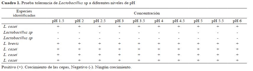 Prueba de tolerancia a pH. Los siete aislados de Lactobacillus fueron sometidos a la prueba de tolerancia a pH, observándose crecimiento bacteriano únicamente en las especies identificadas como Lactobacillus brevis y Lactobacillus casei. Para los géneros de Lactobacillus sp, las condiciones de pH no fueron favorables para su crecimiento (cuadro 1).