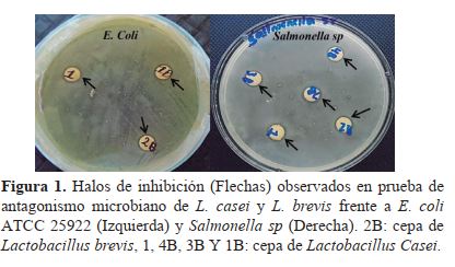 Capacidad antagónica de las cepas Lactobacillus sobre bacterias patógenas. Las especies Lactobacillus casei y brevis exhibieron actividad antagónica contra el patógenos E. coli ATCC 25922 y Salmonella sp, observándose halos de inhibición con diámetro de 10mm, indicando que los aislados identificado tienen la capacidad de inhibir el crecimiento del patógeno (figura 1).