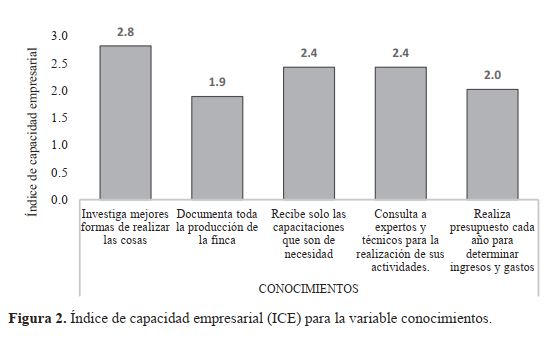 Los productores presentan un bajo Índice de capacidad empresarial (<3) en la variable conocimientos que considera los aspectos de hacer las cosas de una forma diferente, la documentación de la producción, la participación en las capacitaciones, la consulta a expertos y técnicos para tomar decisiones en el desarrollo de sus actividades y la presupuestación anual.