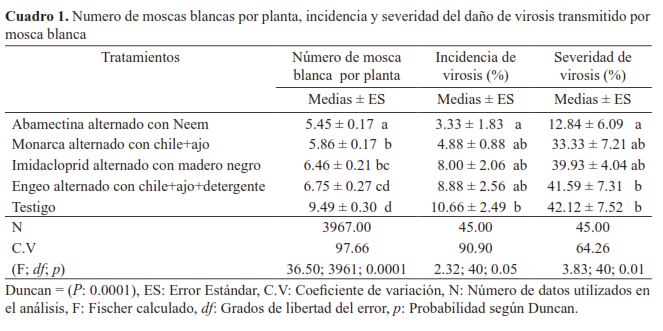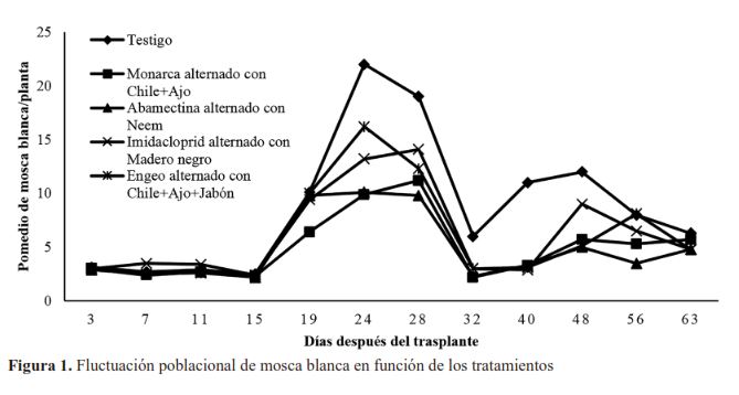 Aplicaciones alternas de insecticidas químicos y botánicos para el manejo de mosca blanca (Bemisia tabaci, Gennadius) y Geminivirus en tomate (Solanum lycopersicum L.) en Tisma, NicaraguaChemical insecticides alternating with botanical insecticides as management options of whitefly (Bemisia tabaci, Gennadius) and Geminivirus in tomato (Solanum lycopersicum L.) in Tisma Nicaragua |