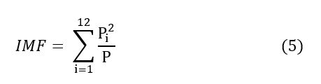 Arnoldus (1977) también demuestra que existe una alta correlación entre el índice de erosividad Ra y el índice IMF. Los resultados concuerdan muy bien con los valores de aquellas estaciones para las cuales el índice Ra ha sido calculado con el método del RUSLE. Los resultados anteriores fueron confirmados por Renard y Freidmund (1994) en Estados Unidos de América (EE. UU.) con un alto coeficiente de correlación. El IMF ha sido utilizado en estudios para estimar Ra en varios países como Colombia (Rivera y Gómez, 1991), España (De Luis et al., 1997; Pérez y Senent, 2015) y Marruecos (Saldaña et al., 2014). Se determinaron los valores mensuales del IMF en las estaciones pluviográficas derivados de la ecuación (5), dividiendo el cuadrado de la precipitación del mes en cuestión (Pi2) por la precipitación promedio anual de la serie (P), de esa forma se obtiene un IMF para cada mes.