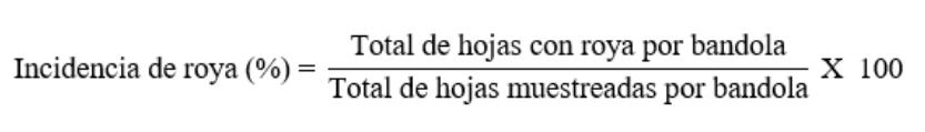 Incidencia de roya (%). La incidencia de roya se medió utilizando el total de hojas afectadas con roya del café de cada bandola, dividido entre el total de hojas por bandola multiplicadas por cien, para obtener el porcentaje de incidencia según la ecuación propuesta por Vargas (2017).